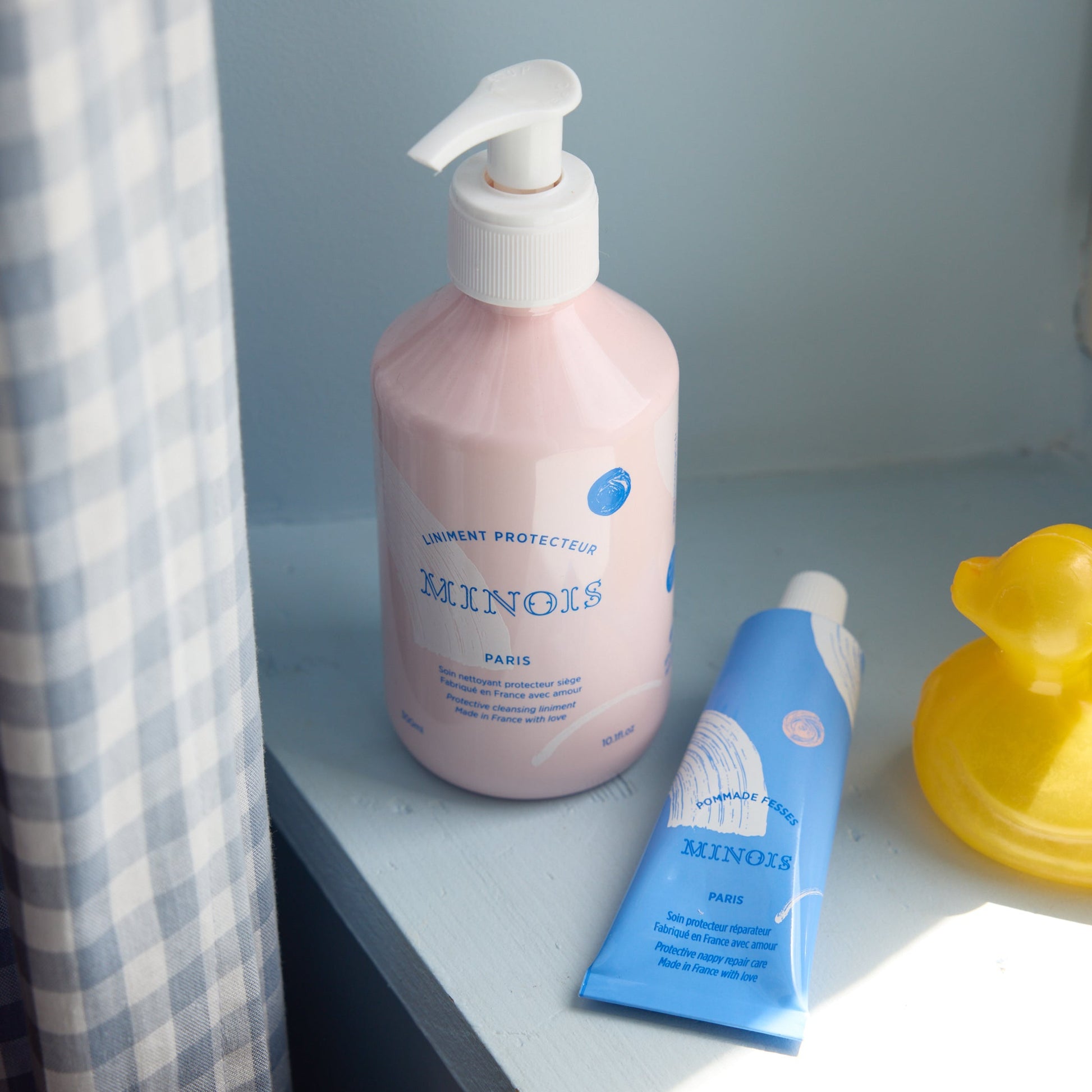 Notre routine naturelle pour un change apaisé : le Liniment Protecteur associé à notre Pommade Fesses. Nos deux essentiels du quotidien pour nettoyer et protéger la zone du siège, calmer immédiatement les irritations et limiter l’apparition des rougeurs.