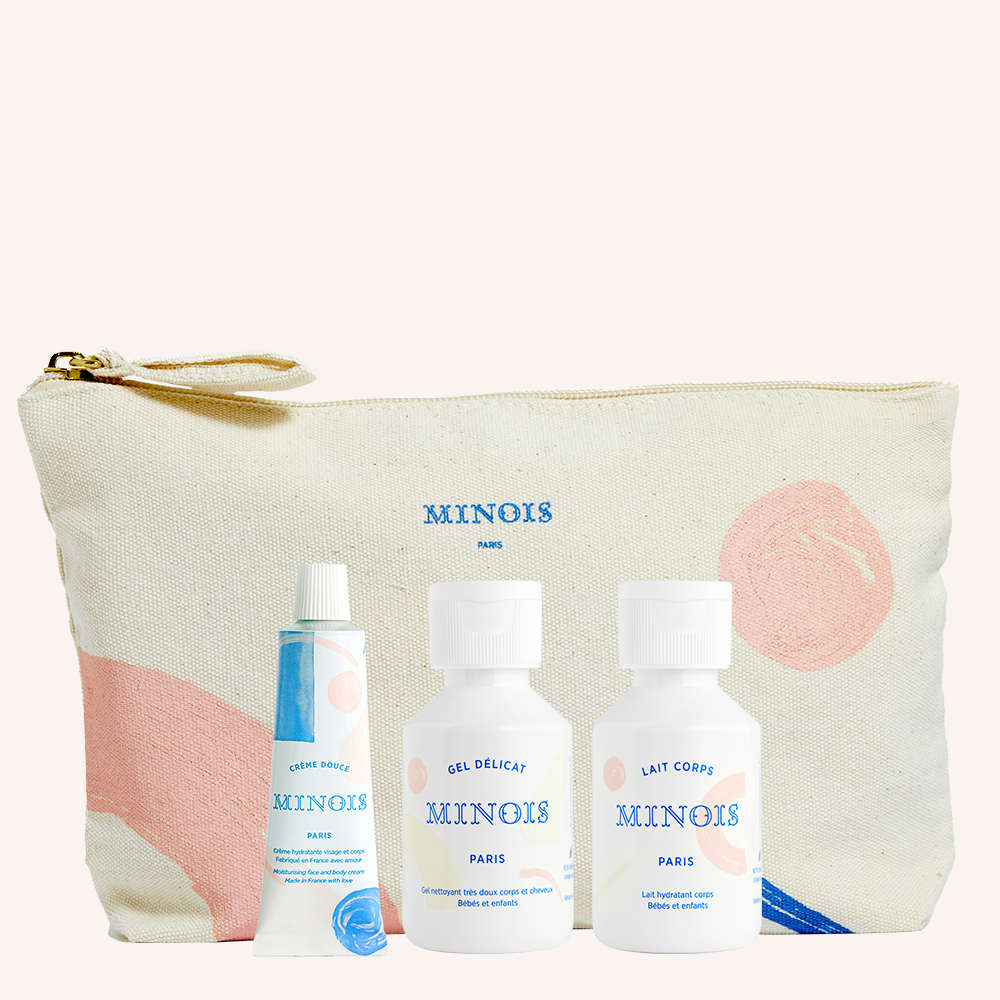 Notre Trousse Les Essentiels regroupe 3 soins iconiques au format voyage (100ml et 30ml) - le Gel Délicat, la Crème Douce et le Lait Corps - dans une jolie trousse aux couleurs Minois.